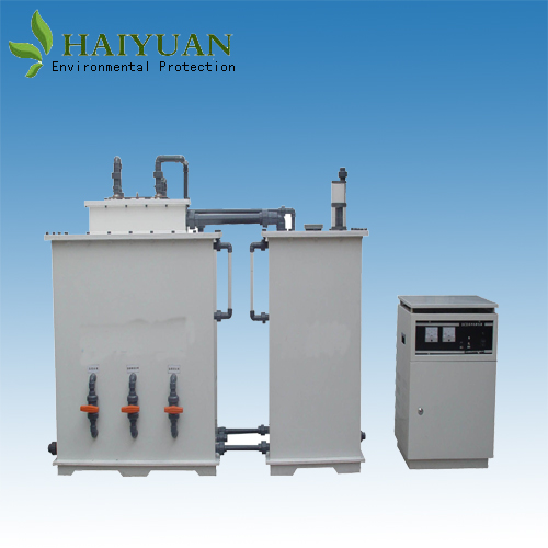設(shè)備組成及工作原理: 1、設(shè)備組成 KW系列高效混合消毒劑發(fā)生器由電解槽、直流電源、鹽溶解槽及配套管道、閥門、儀表等組成。 2、工作原理 將一定濃度或飽和鹽液加入電解槽陽極室,同時(shí)將清水加入電解槽陰極室。接通12V直流電源開始電解,即可產(chǎn)生ClO2、Cl2、O3、H2O2等混合消毒劑,經(jīng)水射器負(fù)壓管路將氣體吸入水中消毒。 型號(hào)規(guī)格: